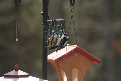 On my way out the door yesterday morning, I noticed the feeders were almost empty, but there seemed to be enough to make it until lunch time. At one point mid-morning, I was looking out my office window and saw a Downy Woodpecker exploring a couple of nearby trees. The director with whom I was chatting on the phone was not nearly as excited as I was (perhaps her inability to see it from 100 miles away had something to do with it.) As soon as I hung up, I broke out the old binoculars that lurk around the office and watched the downy for a moment before it flew away. However, it would not be my last encounter with that woodpecker yesterday…